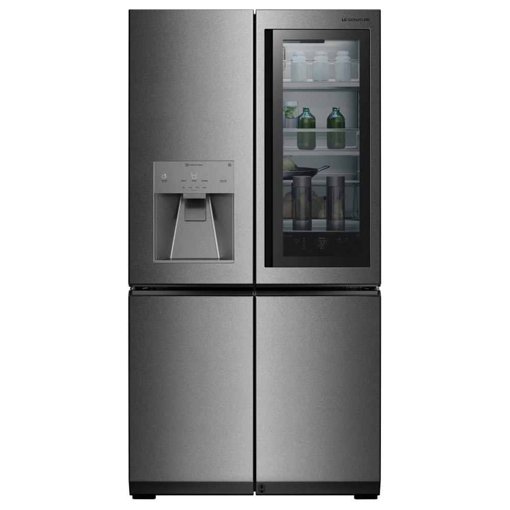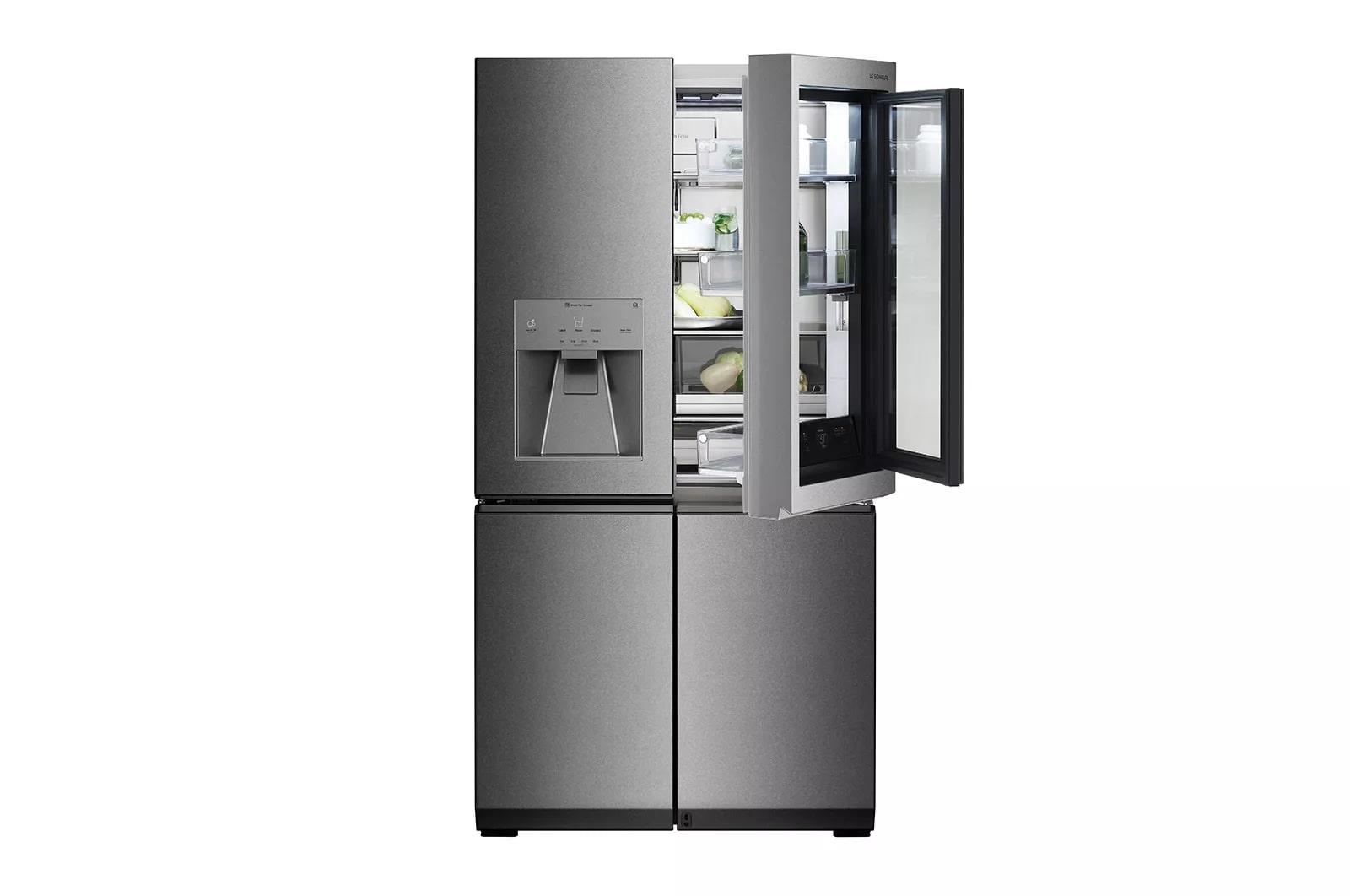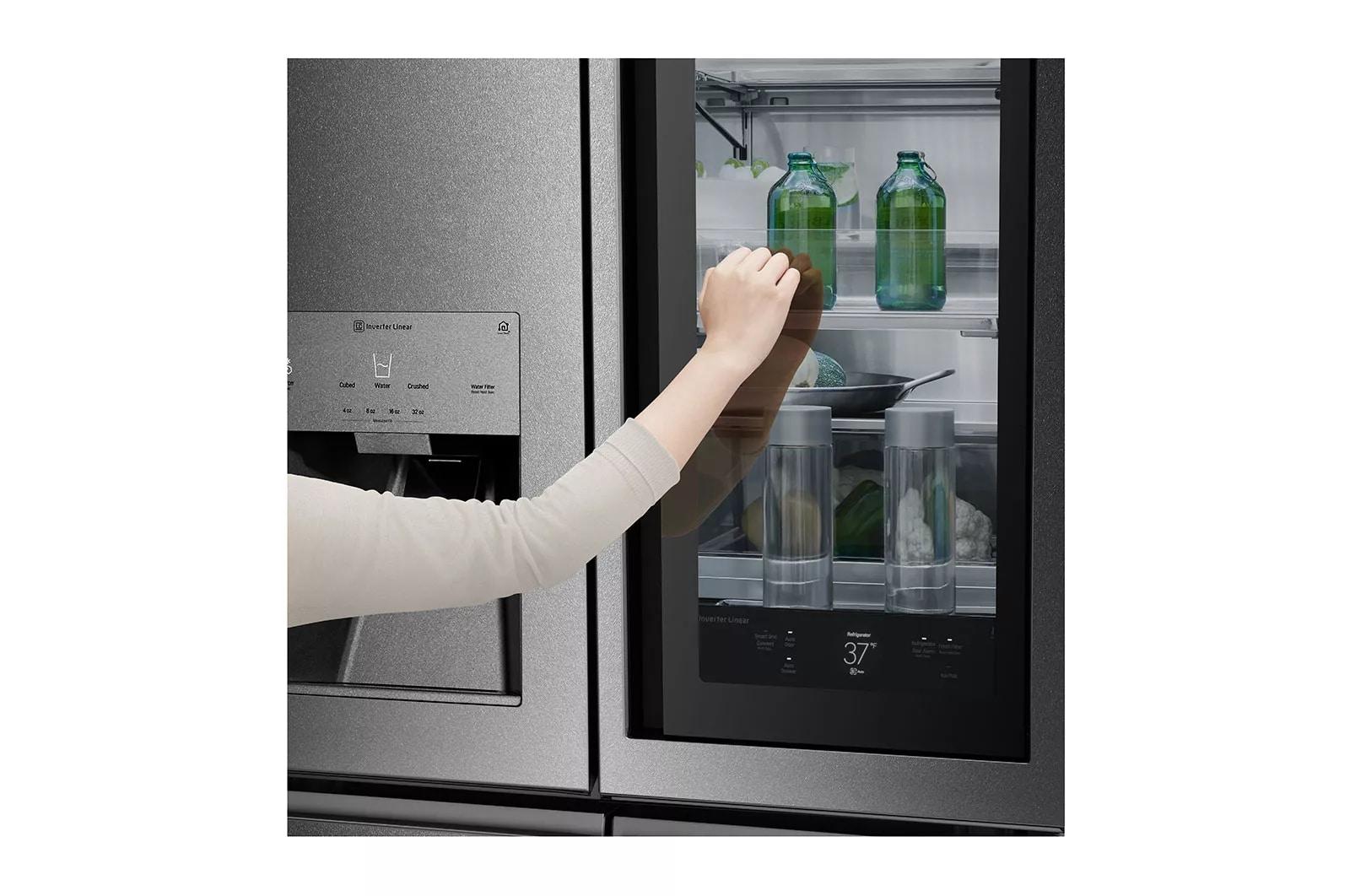 feature is a smart sensor detector at the foot of the refrigerator that opens the door automatically. Just step on the "Door Open" light projection on the floor in front of the refrigerator and the door gently opens.
