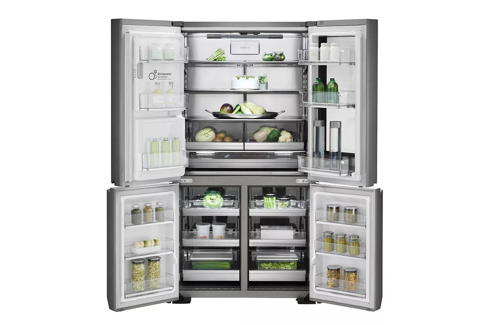 feature is a smart sensor detector at the foot of the refrigerator that opens the door automatically. Just step on the "Door Open" light projection on the floor in front of the refrigerator and the door gently opens.