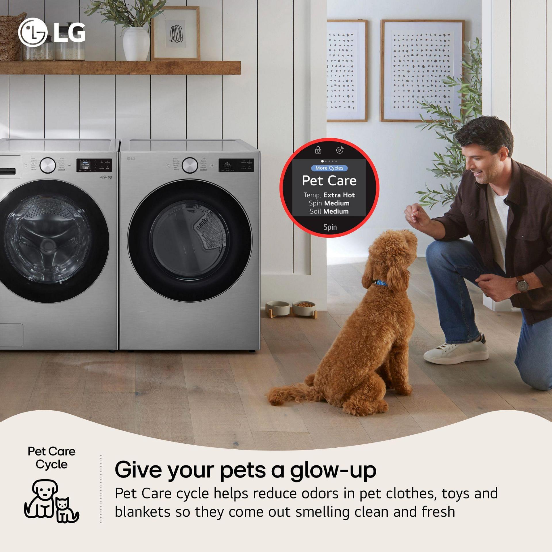 Make quick work of large loads with mega capacity and our timesaving TurboWash® 360° technology. Easily find just the right cycle with hybrid electronic controls offering the quick convenience of a dial plus helpful information and more options through the LCD display. Or let LG built-in intelligence do it for you, with AI technology and advanced sensors that detect fabric texture and load size to automatically select the perfect settings.