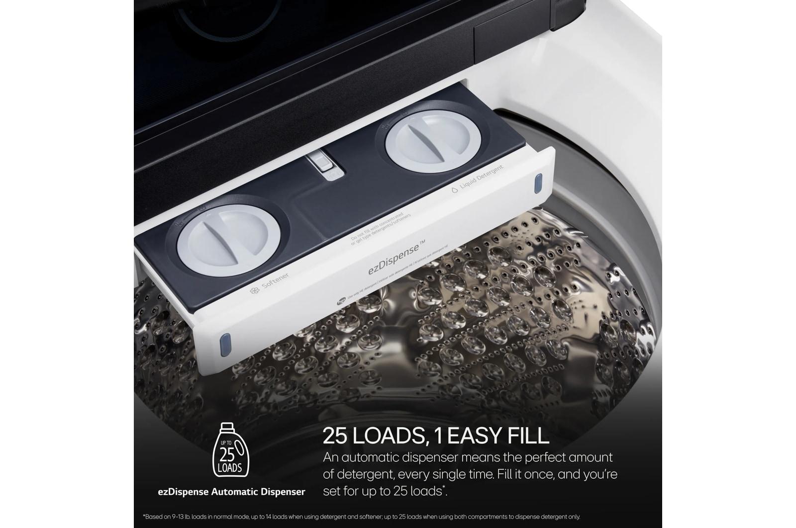 • With ezDispense(R) Automatic Dispenser, just fill the reservoirs once and you're set for up to 14 to 25 wash cycles 4 with versatility of using detergent and softener or detergent only. Not only is it quick and easy, but it helps make laundry foolproof, adding just the right amount for each load size-at just the right time. You can even get an alert on your smartphone when it's time to refill, so you never miss a beat! 5