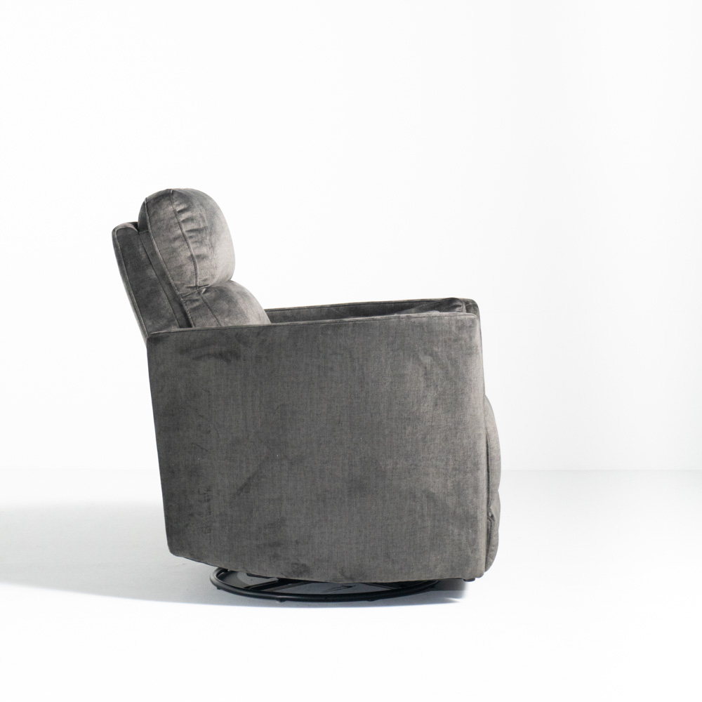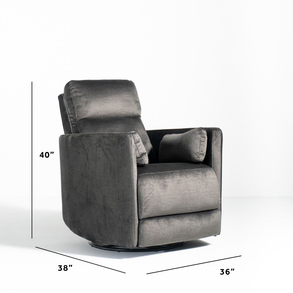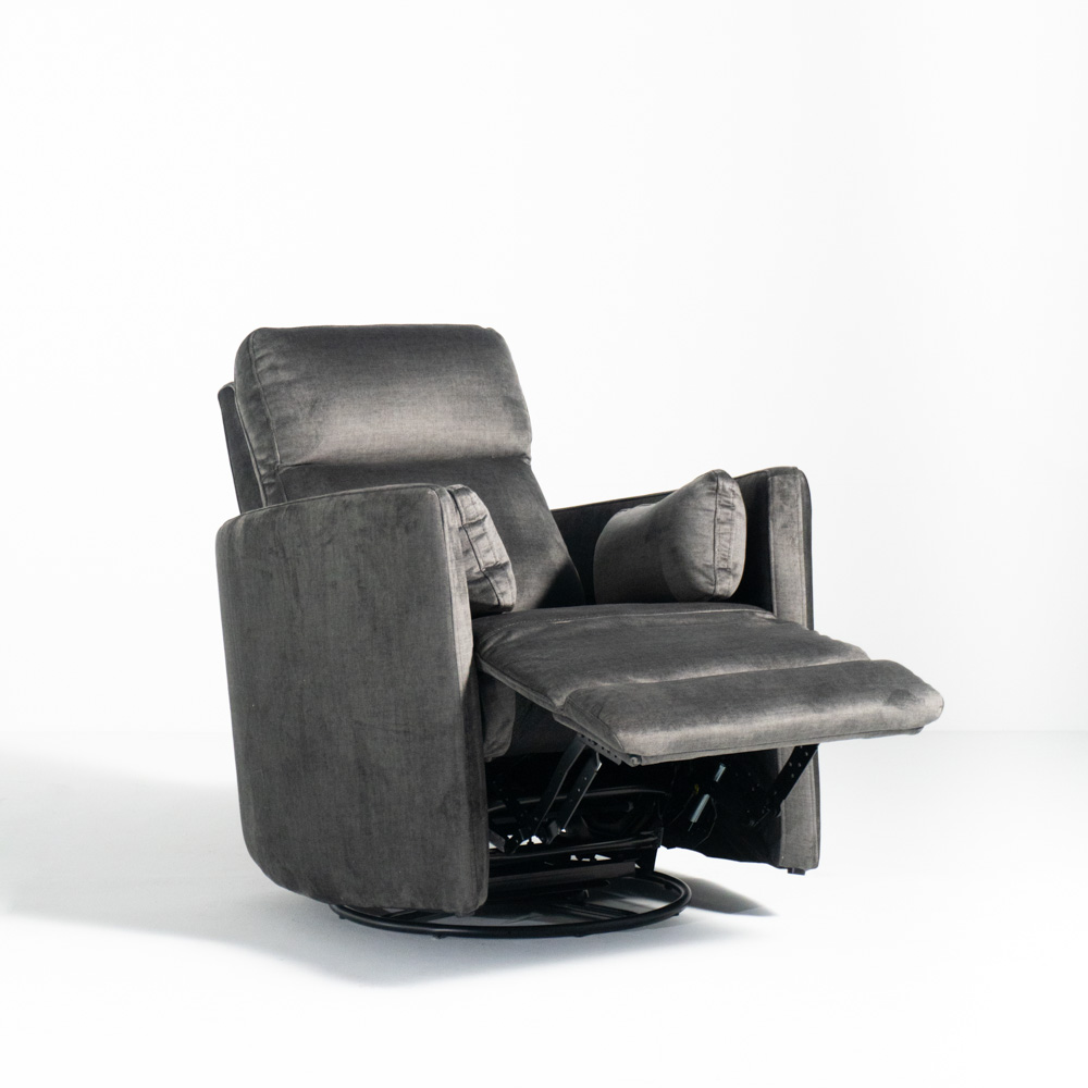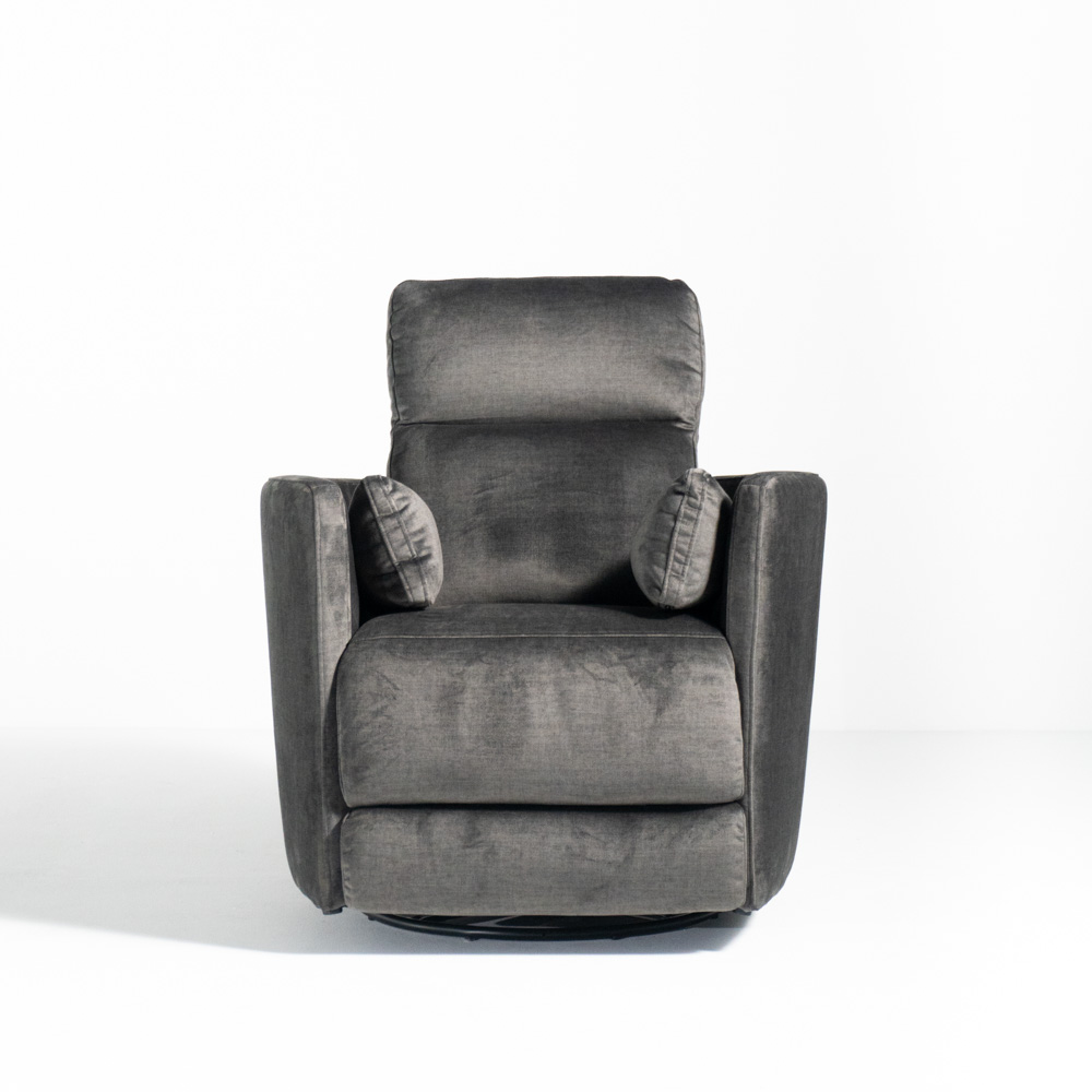 Relax in style with the Man Wah Swivel Glider Recliner in Capri Graphite. Designed for comfort and durability, it features plush cushions, a side pull-tab for easy reclining, and a smooth swivel-glide mechanism.