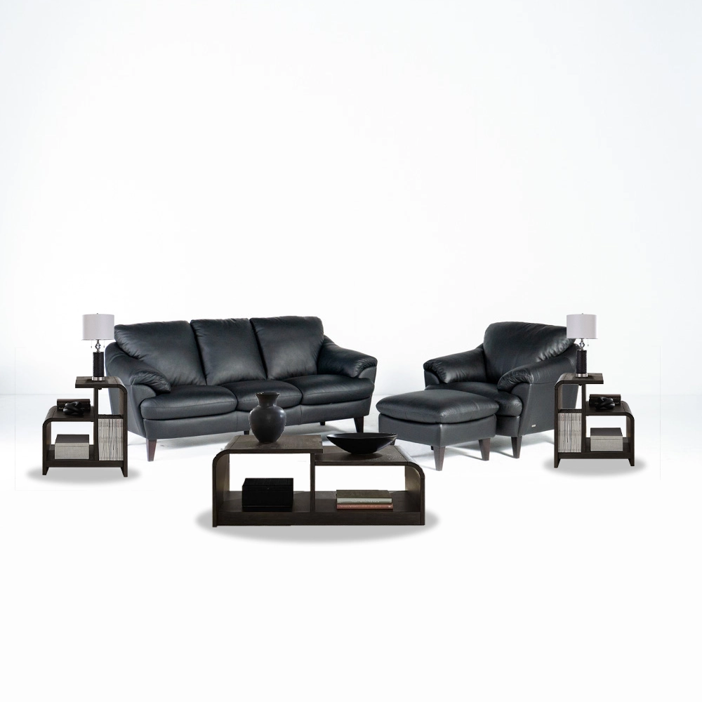 Upgrade your living space with the Pisa 8-Piece Living Room Package, featuring a sleek black leather sofa, matching chair, and ottoman for premium comfort and style. This complete set also includes a contemporary cocktail table, two end tables, and two stylish lamps—creating a cohesive and sophisticated look for your home. Designed for both comfort and elegance, the Pisa collection is perfect for modern living.