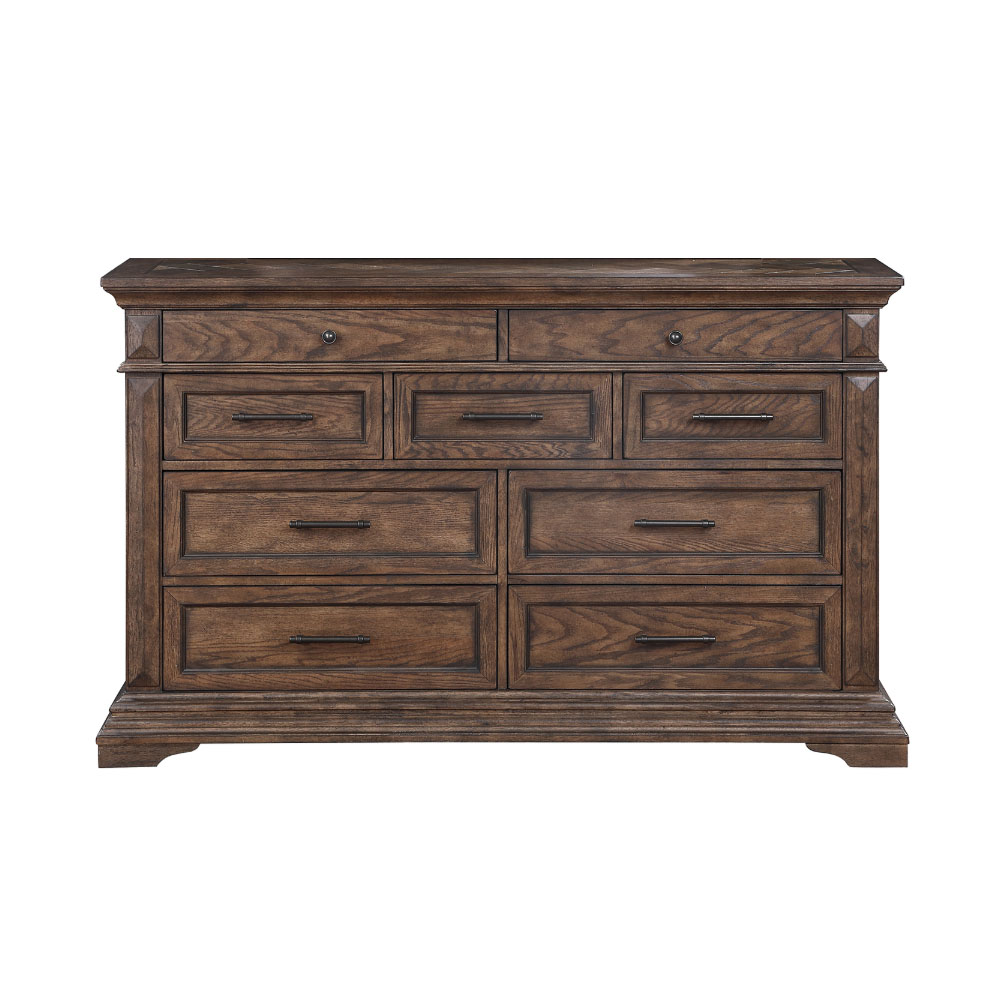 The Mar Vista 9-Drawer Dresser in Walnut is a perfect blend of elegance and practicality. Crafted from solid Rubberwood and Oak veneers, its rich walnut finish is enhanced through distressing, wire brushing, and charcoal glazing. Traditional crown moldings, carved bracket feet, and herringbone wood inlays add timeless charm. The spacious drawers feature English dovetail joinery and full-extension glides, with velvet-lined top drawers, cedar-lined bottom drawers, and a removable felt-lined jewelry tray for added convenience. Designed for durability and sophistication, this dresser is a refined addition to any bedroom.