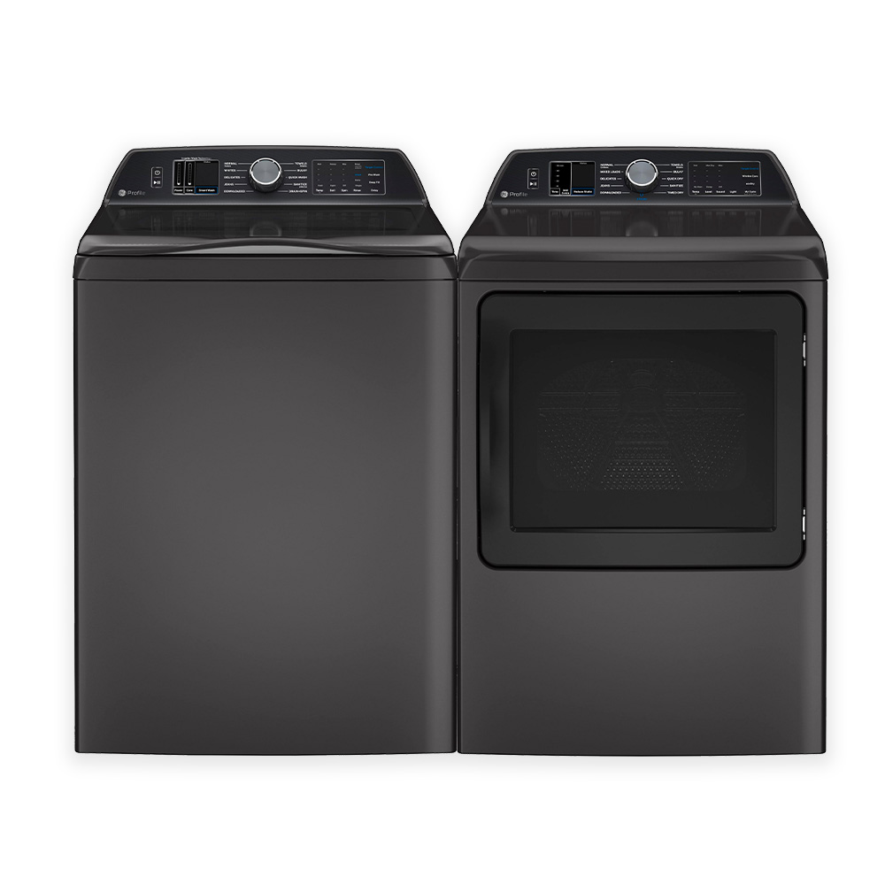 Upgrade your laundry routine with this sleek black GE Profile™ pair. The 5.4 cu. ft. washer features Smarter Wash Technology, FlexDispense®, and a spacious design for powerful cleaning. Pair it with the 7.4 cu. ft. gas dryer, offering Sensor Dry and a Sanitize Cycle for efficient, thorough drying.