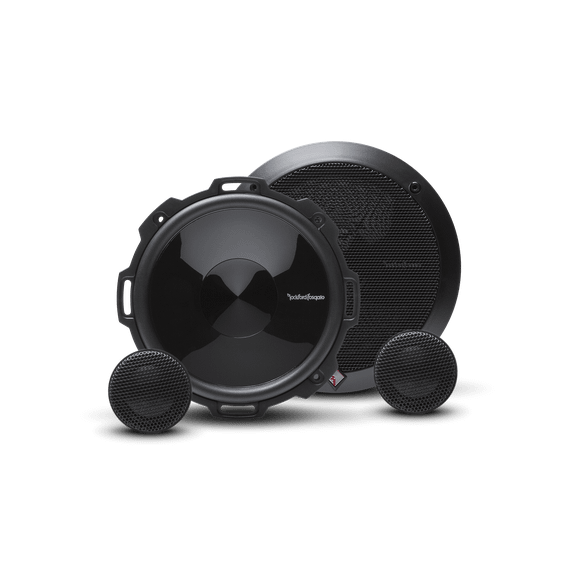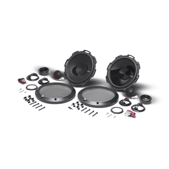 The P1675-S is a 6.75" 2-way component system with 1" soft dome tweeters and is rated at RMS. The system includes a pair of tweeters, two woofers with grilles, integrated crossovers, and mounting hardware.