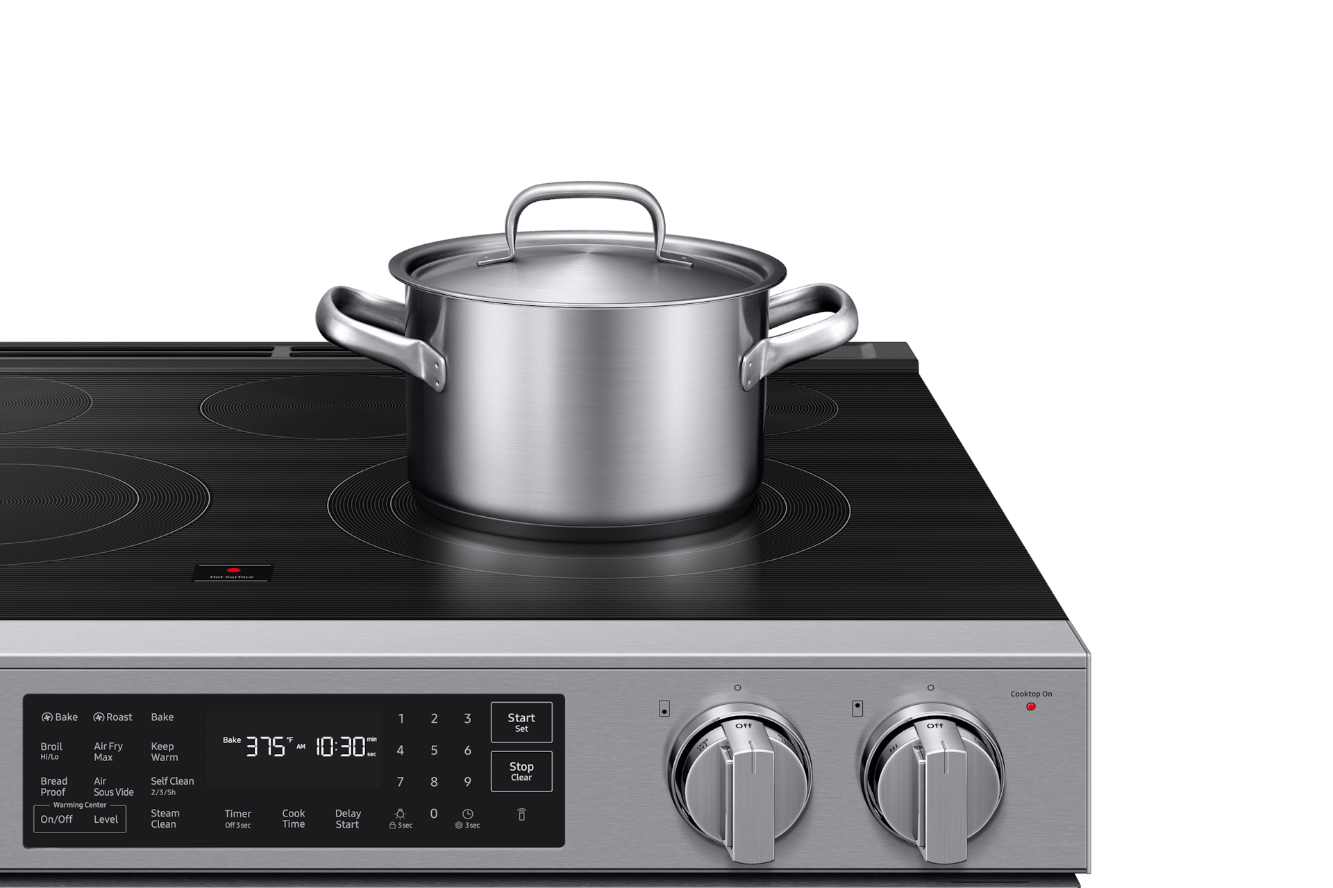 • Cook fast and evenly with the powerful 3kW electric cooktop. Ideal for sauteing, searing, or boiling water quickly, its five burners include two dual-ring elements for flexible pan sizes.