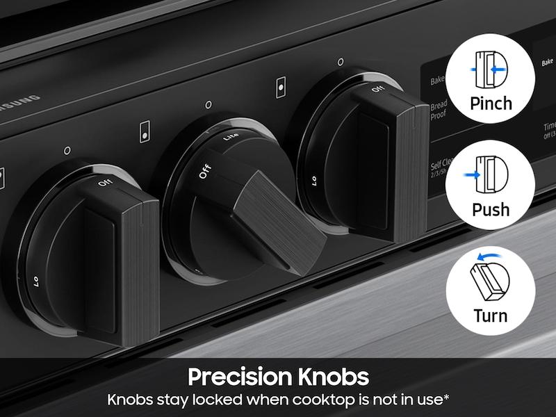 Knobs stay locked when cooktop is not in use. Integrated knob buttons must be pinched in before the knobs can be turned.