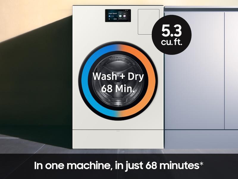 This 5.3 cu. ft ultra large capacity combo washer + dryer delivers a complete Wash + Cycle in 68 minutes, so laundry is clean and ready to fold.**
