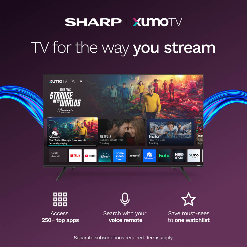© 2025 Sharp Electronics Corporation. All rights reserved. Sharp, AQUOS, and all related trademarks are trademarks or registered trademarks of Sharp Corporation. Separate subscriptions are required to view content through various paid applications. Additional fees may apply to access live content. Terms apply. Xumo TV, Xumo Play, and all other Xumo product names, logos, slogans or marks are the trademarks of Xumo or its licensors. ©2025 Xumo. Services subject to all applicable service terms and conditions, subject to change. Services not available in all areas. Restrictions apply. Amazon, Alexa and all related logos are trademarks of Amazon.com, Inc. or its affiliates. Apple®, AirPlay®, Apple Home®, and HomeKit® are trademarks of Apple Inc., registered in the U.S. and other countries and regions. To use AirPlay and HomeKit with Sharp Xumo TV, the latest version of iOS, iPadOS, or macOS is recommended. Use of the Works with Apple Home and Works with Apple AirPlay badges means that an accessory has been designed to work specifically with the technology identified in the badge and has been certified by the developer to meet Apple’s performance standards. Apple is not responsible for the operation of this device or its compliance with safety and regulatory standards. Dolby, Dolby Vision, Dolby Audio, and the double-D symbol are trademarks of Dolby Laboratories Licensing Corporation. Manufactured under license from Dolby Laboratories. All other trademarks are property of their respective owners. Screen images for illustration. Actual screen may vary. Remote images for illustration. Actual remote may vary.