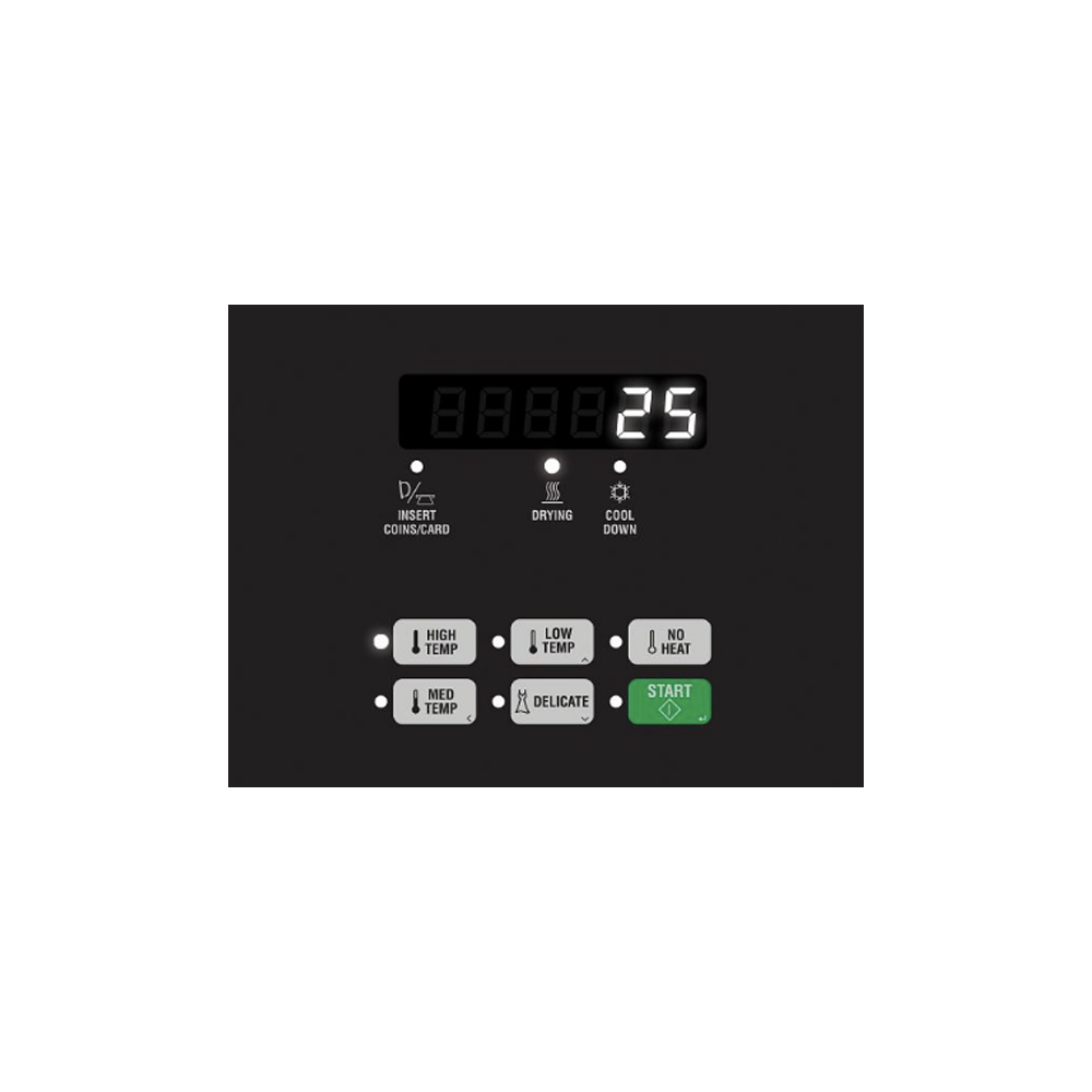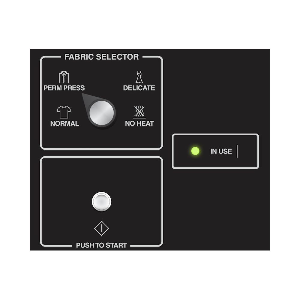 • E-Mech - The E-Mech control features a straightforward design that offers customers simple water temperature and fabric selections, using cue lights to monitor progress through the wash cycle. This control is designed to function with any coin slide manufacturer’s equipment.