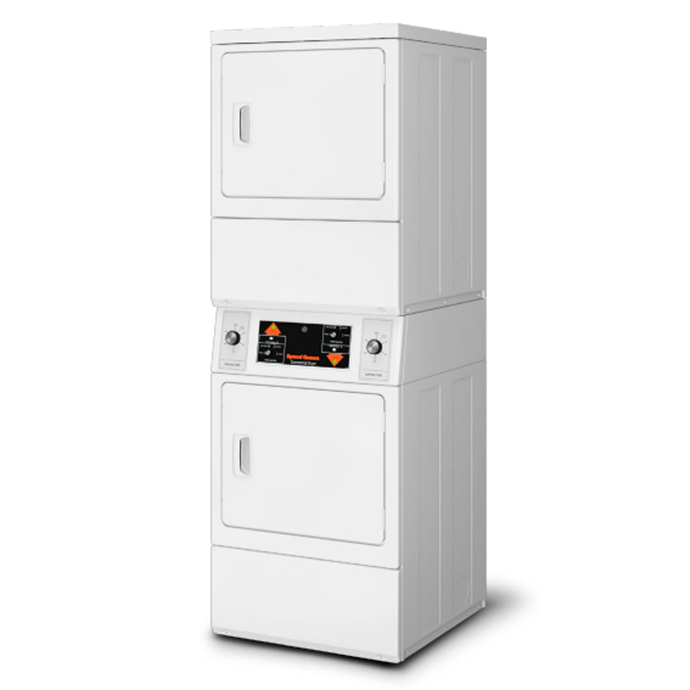 Maximize drying capacity with the Speed Queen® Push-to-Start stacked gas dryer. This space-saving unit features two independent dryer cylinders, each delivering efficient performance, reliable operation, and fast drying with a high-efficiency 220 CFM blower system — built to handle the demands of commercial use.