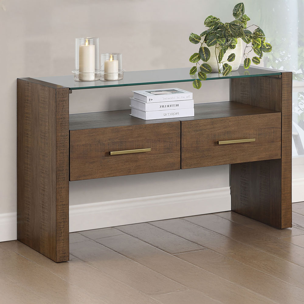 Bring casual elegance to your hallway, living room, or office with the Garland Glass Top Sofa Table, a blend of modern design and rustic charm. Its clean lines and saw rasp distressing in a warm toffee finish create a stunning console. The clear glass top offers an unobstructed display area, while two drawers provide practical storage for essentials. Functional and stylish, this versatile table enhances any space, adding both elegance and utility to your home. A chic addition to any décor.