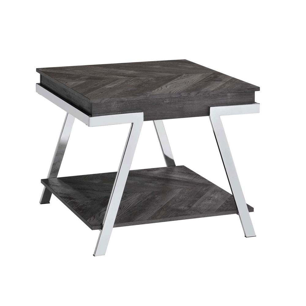 • Styling Details Include Rustic Appearance Combined With Canted Chrome Legs, Simulated Chevron Veneer Pattern