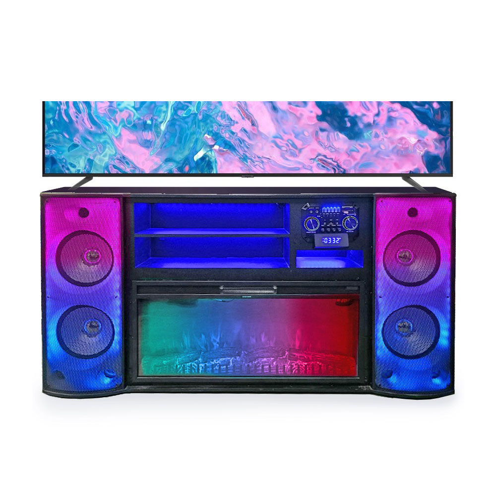 The TECHNICAL PRO Integrated Audio 70" TV Stand is the ultimate fusion of entertainment and comfort. Designed to accommodate large TVs, it features a built-in fireplace insert with adjustable heat settings (400 sq. ft. coverage) and five flame levels to create the perfect ambiance. Its powerful audio system includes four 12" woofers, four tweeters, and a 5-band equalizer for customizable sound. Multiple input options—RCA, AUX, HDMI, USB, SD, optical, 1/4" guitar, and 1/4" mic—ensure seamless connectivity. With an elegant design and advanced features, this TV stand enhances both your viewing and listening experience.