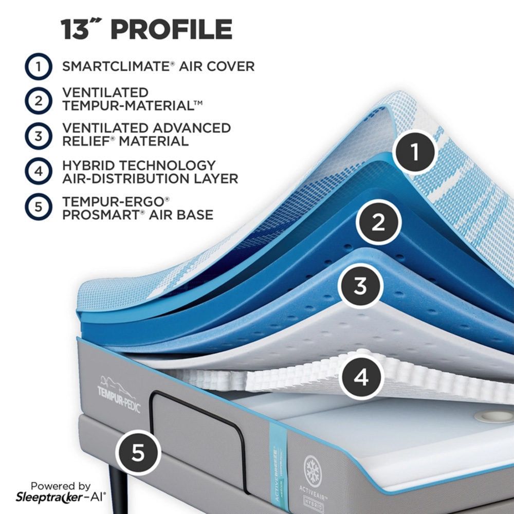 • Air-Distributing Mattress: The patented TEMPUR-ActiveBreeze® hybrid mattress uses a dual-chambered air-distribution layer to gently and evenly distribute cool or warm air across your entire body.