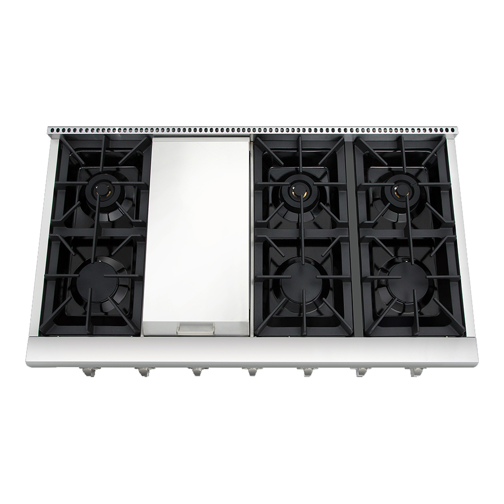 A 48 inch professional gas range top featuring 6 burners, griddle, cast-iron cooking grates, and a stainless steel finish.