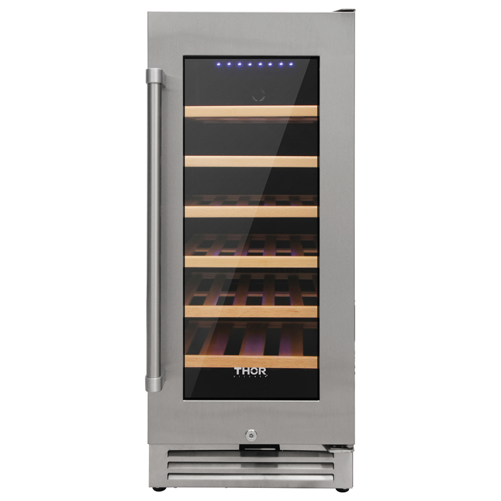 A singe zone wine cooler featuring 33-bottle storage capacity, touch control, LED lighting, and stainless steel finish.