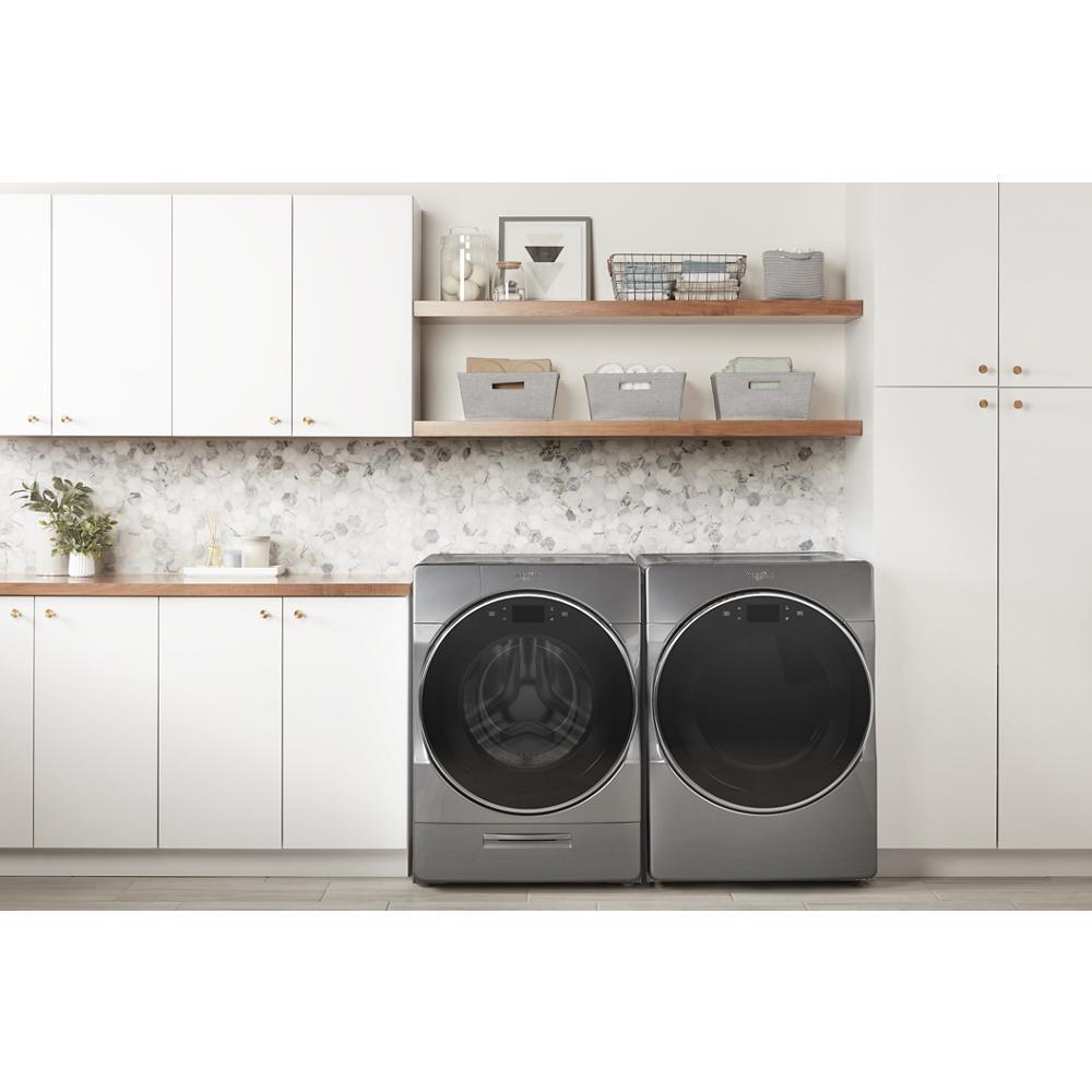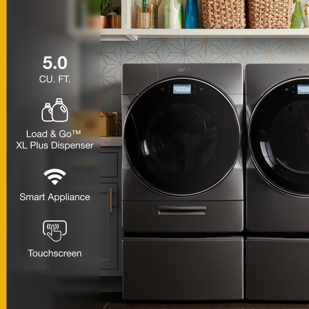 Stay in control and connected from anywhere with a smart front load washer and the Whirlpool app. Fill the Load & Go XL Plus dispenser with detergent and fabric softener once every 40 loads and get notifications when you're running low. And when you need help removing everyday stains, use the front load washing machine s SteamClean option.