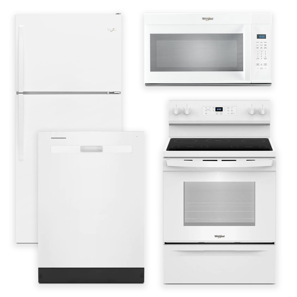 Transform your kitchen with this stunning Whirlpool appliance package, designed to bring both style and functionality to your home. The package includes a sleek top-freezer refrigerator, a versatile freestanding electric range, an over-the-range microwave, and an efficient built-in dishwasher. This Whirlpool appliance package seamlessly blends advanced performance with elegant design, providing the ultimate upgrade for your kitchen.