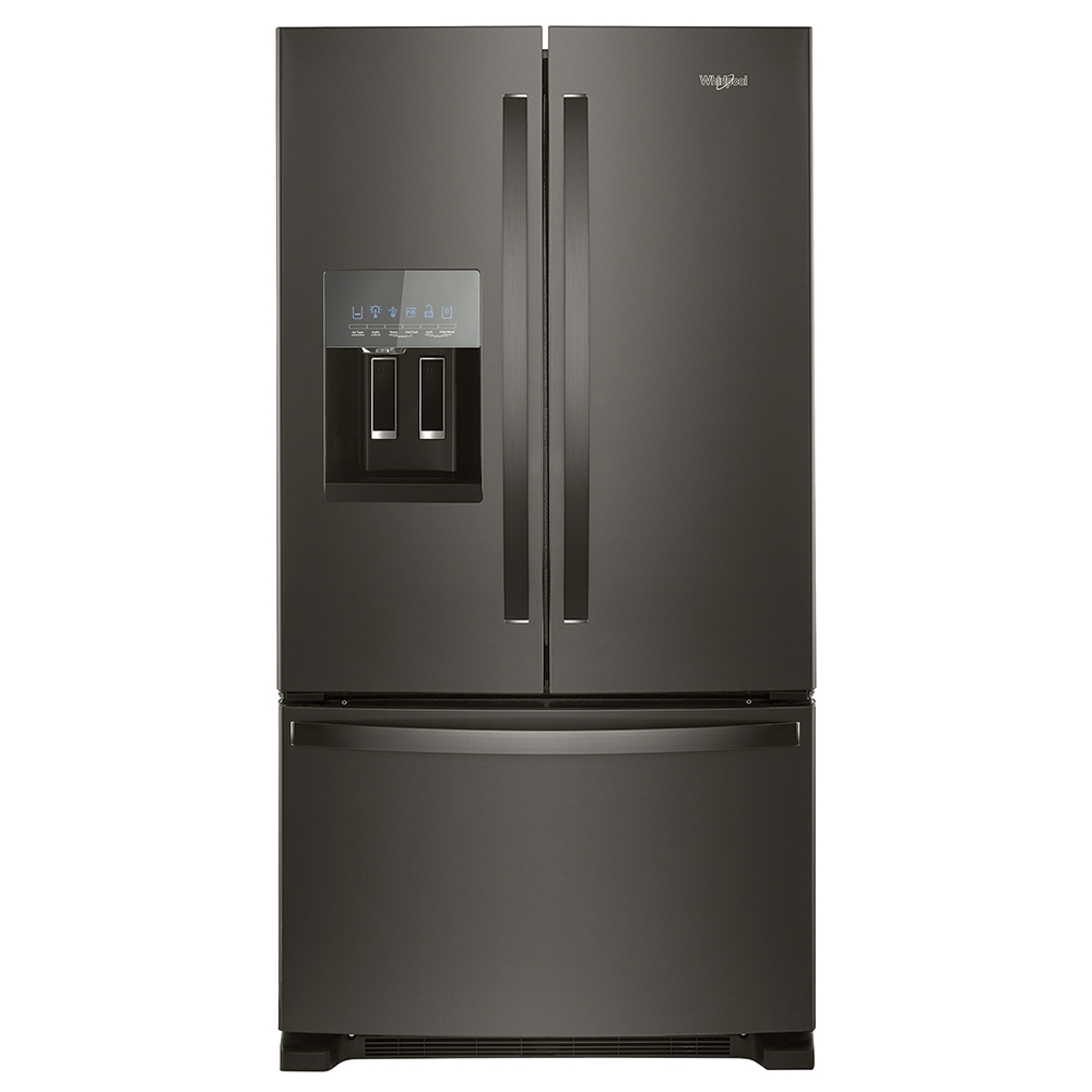 Organize foods for your family in this Whirlpool french door refrigerator available in fingerprint-resistant stainless steel. A humidity-controlled double crisper and two-tier freezer storage provide plenty of room. Spillproof shelves help contain spills and for filtered water right at hand, this refrigerator features an exteriorwater dispenser with EveryDrop ice and water filtration.